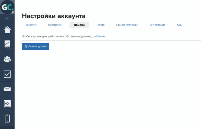 В личном кабинете системы перейдите в раздел «Профиль», затем в подраздел «Настройки аккаунта». Выберите вкладку «Домены», наберите в форме нужный домен и нажмите «Добавить».