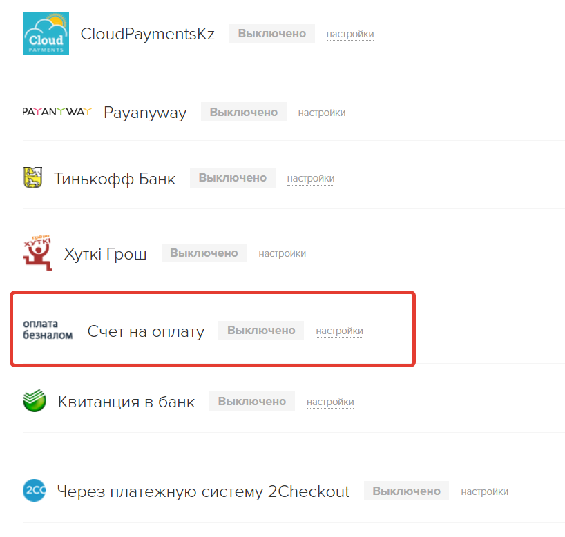 После заполнения всех реквизитов и настроек следует нажать на кнопку «Сохранить», расположенную внизу раздела «Интеграция». После этого статус способа оплаты «Счёт на оплату» должен измениться на «Включено».