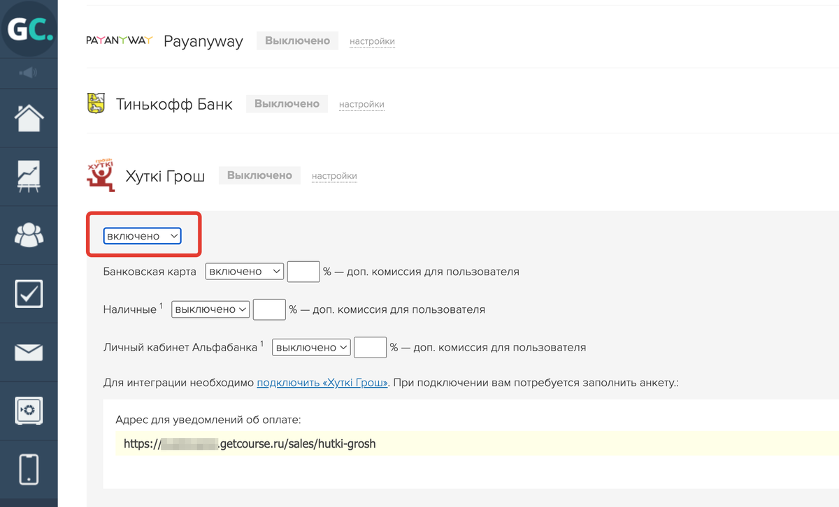 Получив от менеджера Хуткi Грош данные по вашему магазину, внесите их в настройки вашего аккаунта GetCourse: