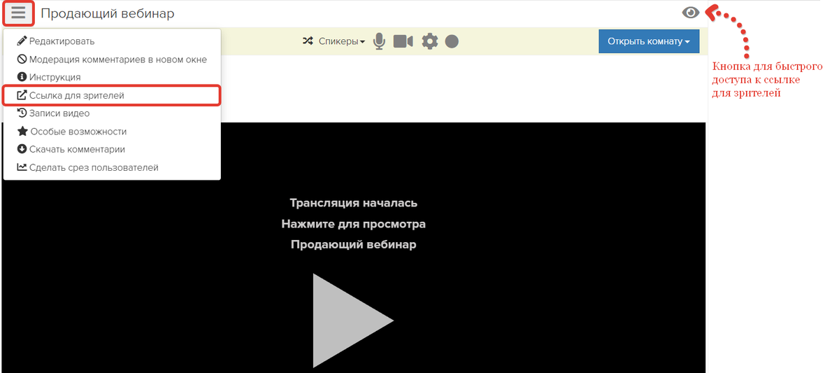 Чтобы убедиться, как пользователи видят вебинарную комнату в данный момент, воспользуйтесь опцией «Ссылка для зрителей».