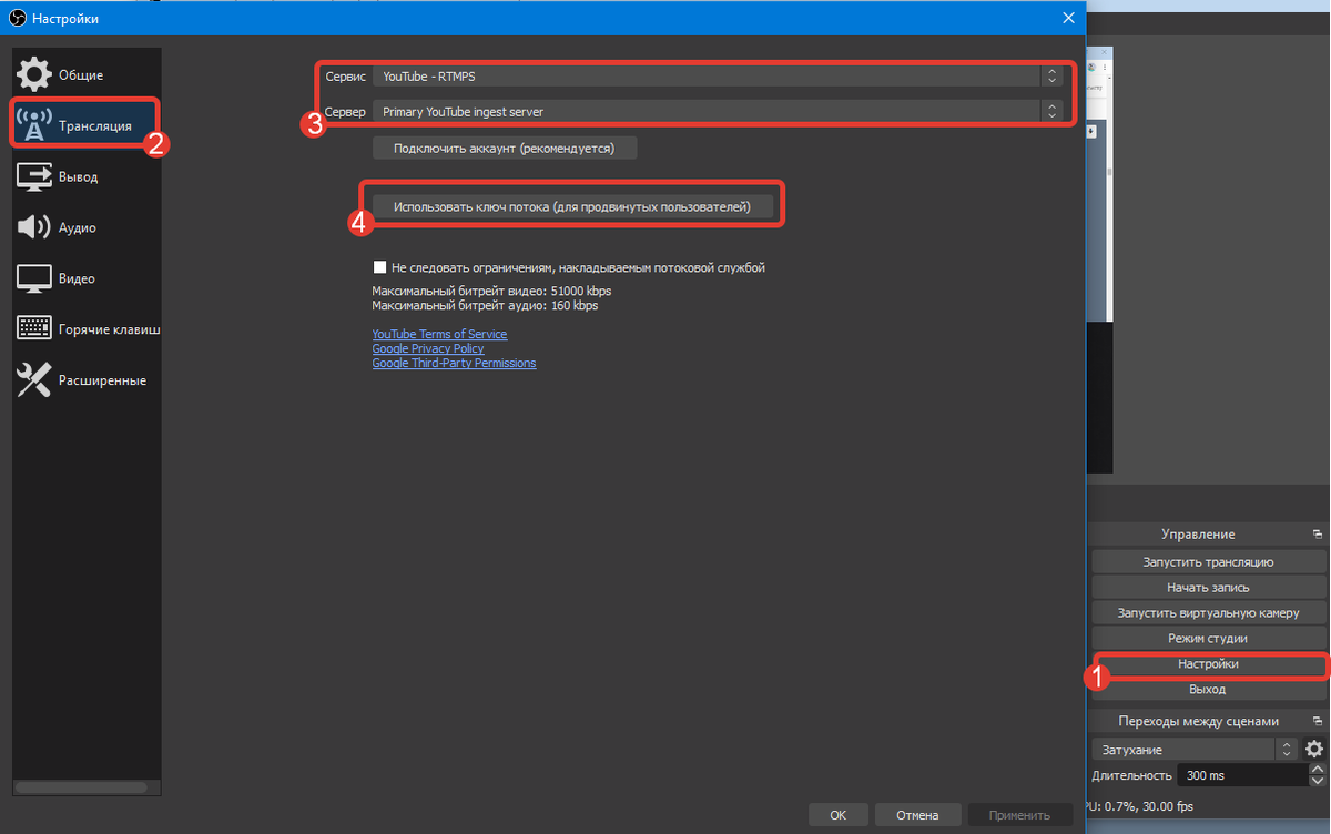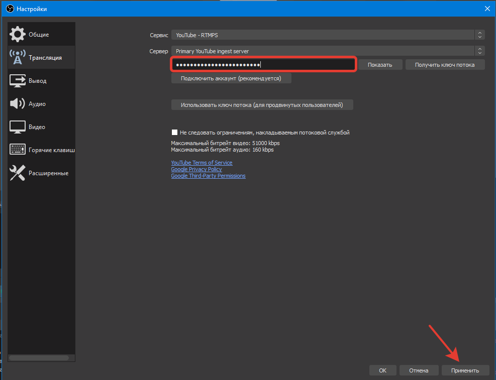 Далее скопируйте ключ трансляции из творческой студии Youtube, откройте настройки OBS studio и на вкладке «Трансляция» вставьте ключ. Примените изменения.