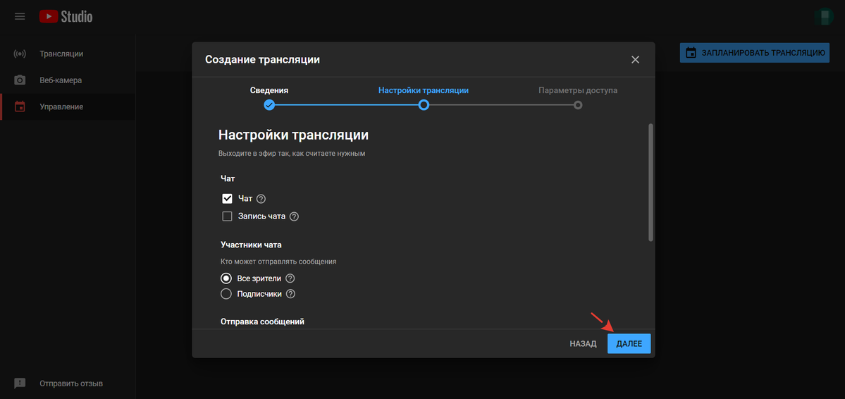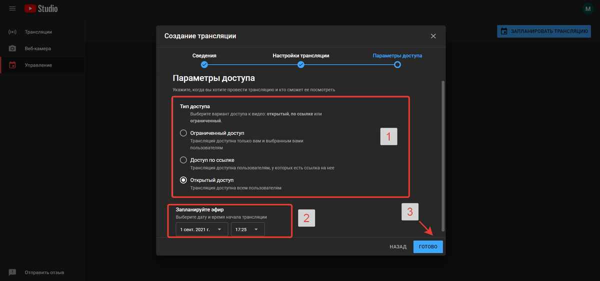 - Открытый доступ — если нужно, чтобы трансляция также отображалась на вашем канале Youtube. Подписчики получат уведомление о ней.