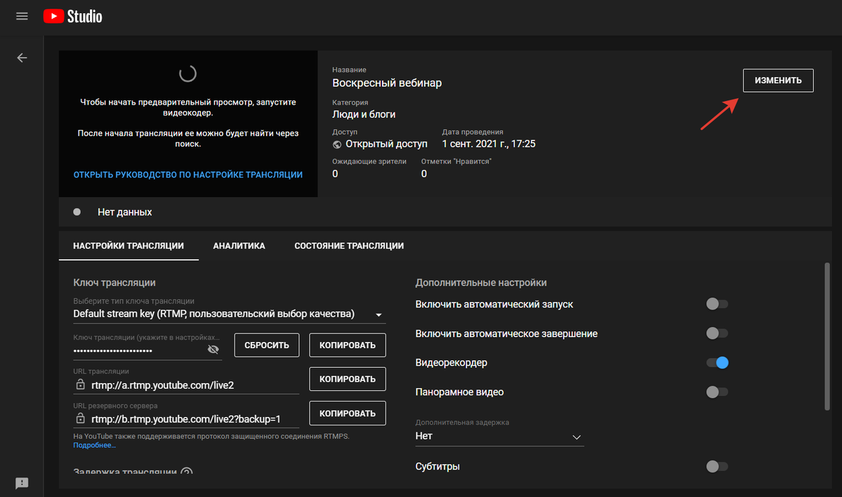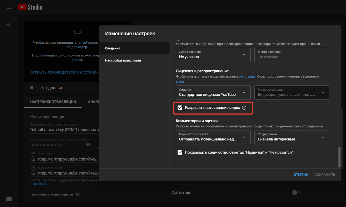 По умолчанию трансляция разрешается для встраивания. Чтобы проверить и изменить эту настройку, перед началом эфира в вашей трансляции нажмите кнопку «Изменить». На вкладке «Сведения» в нижней части окна настроек убедитесь, что установлена галочка «Разрешить встраивание видео».