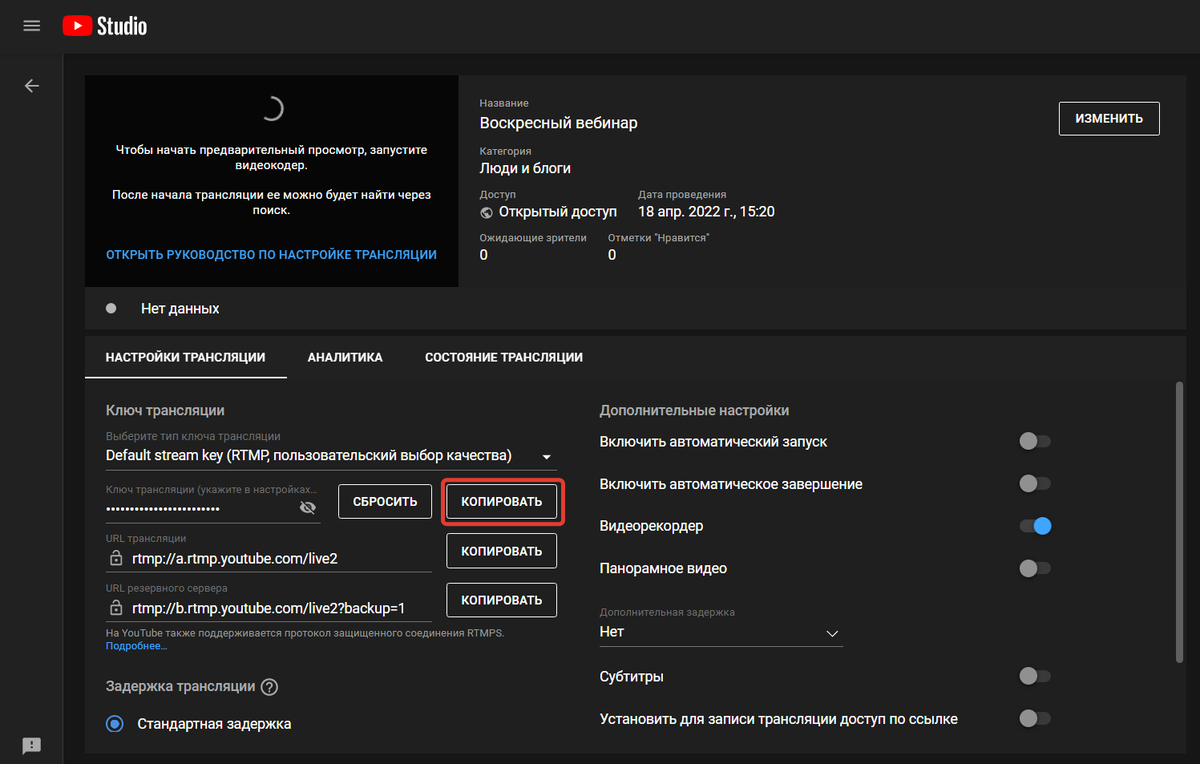 Для создания трансляции через YouTube с помощью видеокодера: