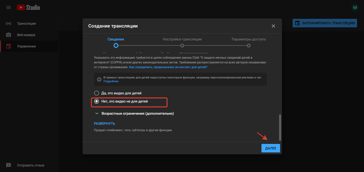 Возрастные ограничения. Youtube относится к фильтрации детского контента с особой серьезностью. Здесь важно выбрать нужный тип. Если трансляция подходит как для детей, так и для взрослых (например, мастер-класс по рисованию), можно установить тип «не для детей» с указанием возрастного ограничения «подходит зрителям младше 18 лет». справочном центре.