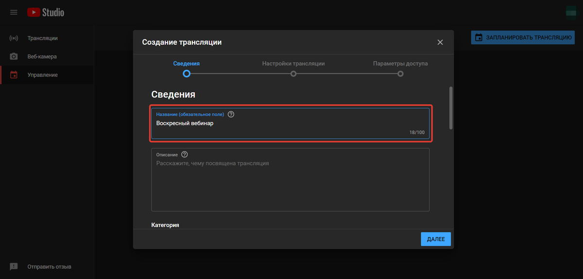 - Заполните обязательные сведения о трансляции: