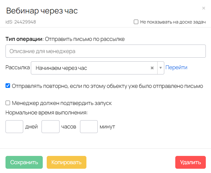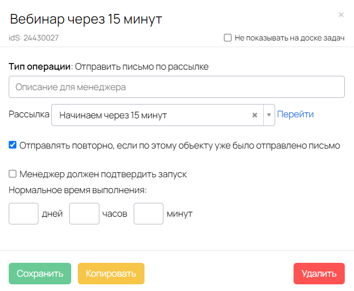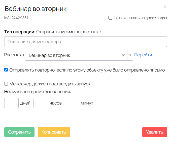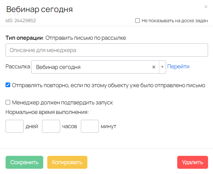 Письма с датой и временем вебинара, а также со ссылкой на вебинарную комнату будут отправляться посредством операции Отправить письмо по рассылке.