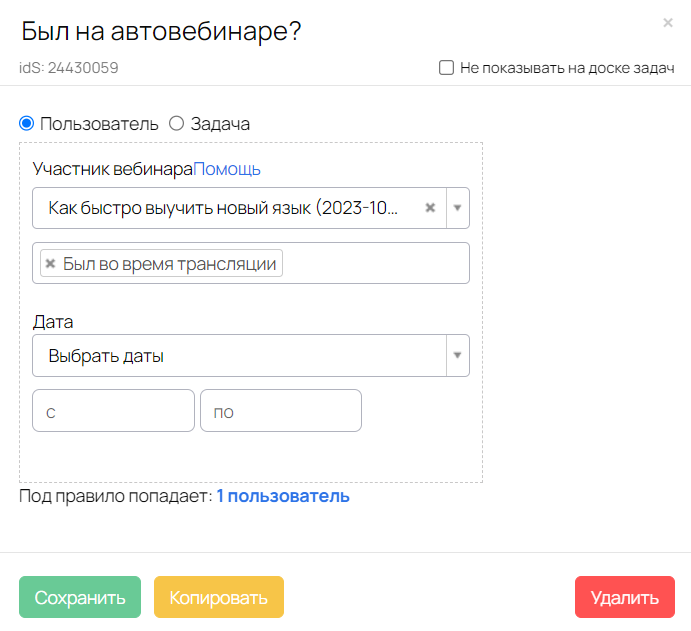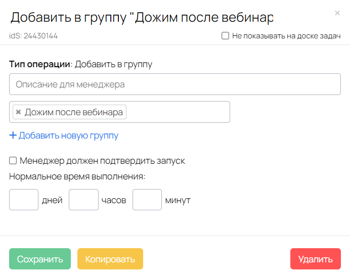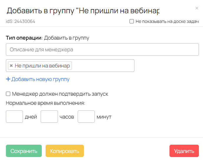 Запуск процесса осуществляется через форму регистрации на вебинар, поэтому массовое создание задач отключено.