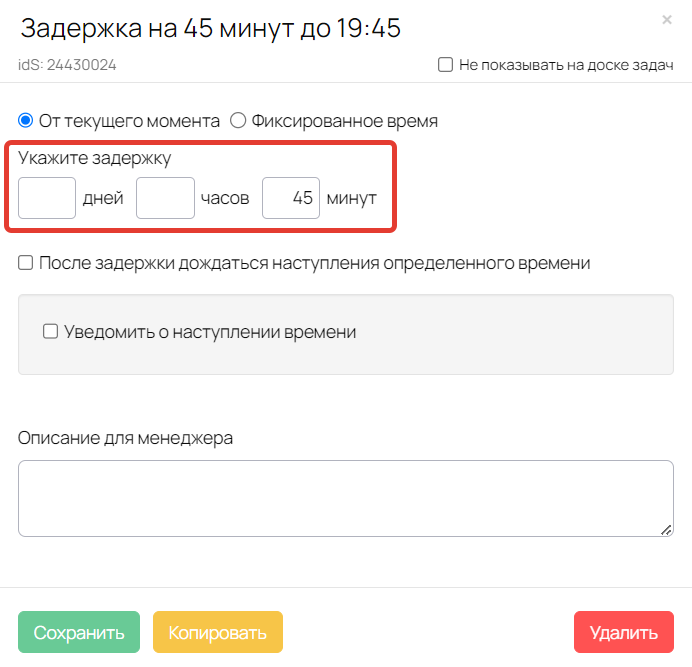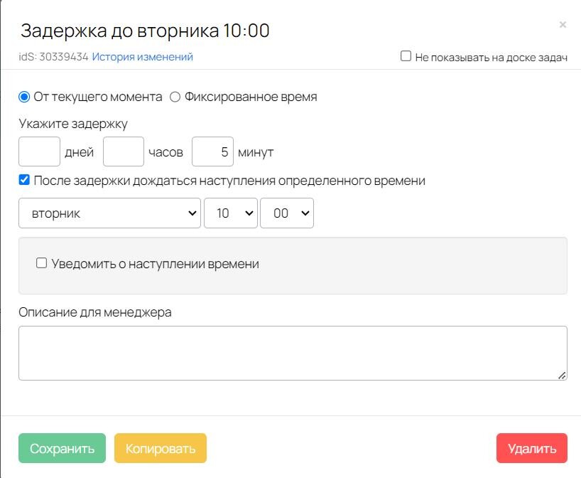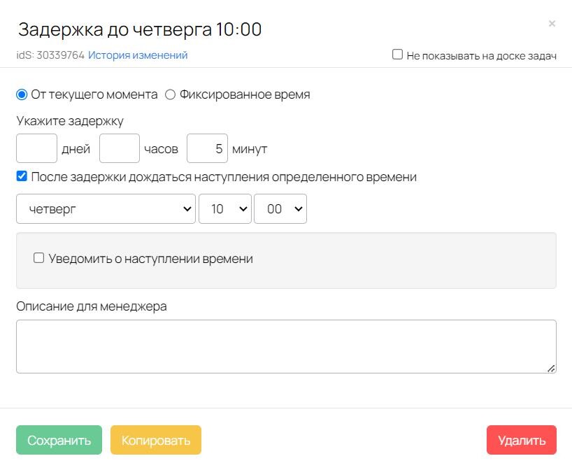 При корректировке блоков процесса под вашу задачу обратите внимание на → рекомендацию об использовании нескольких блоков «Задержка».