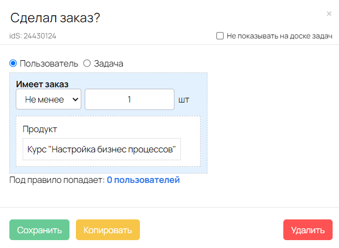 Данное условие позволяет определить, присутствовал ли пользователь на вебинаре и оформлял ли он заказ, а затем, исходя из результата, распределить его между различными группами.