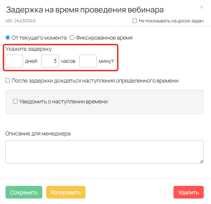 - Блоки 6, 7 — устанавливать задержку до 10:00 утра в день проведения вебинара;