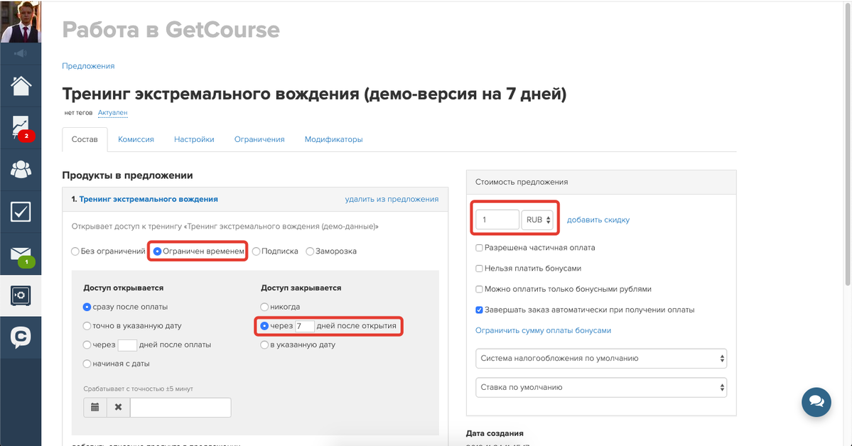 - тестовое предложение по цене 1 рубль (возможно использование ограничения типа «Подписка» или «Ограничен временем»);