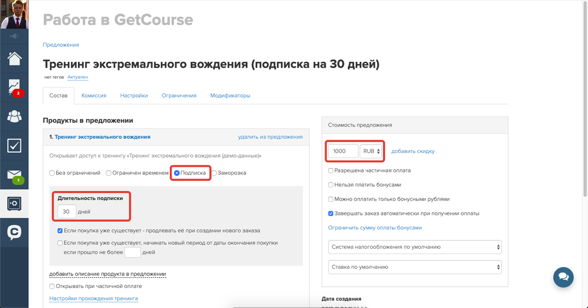 На платформе можно настроить тестовый период подписки по сниженной цене, после чего с привязанной карты автоматически списываются средства для продления подписки по полной стоимости. Пример: первая неделя подписки стоит 1 рубль, а затем списывается полная сумма (1000 руб.).