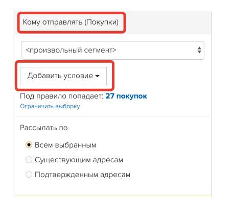 - Кому отправлять — Сегмент выбирается произвольно, без необходимости задавать условия.
