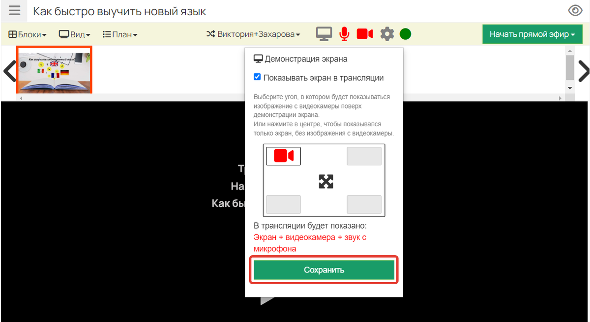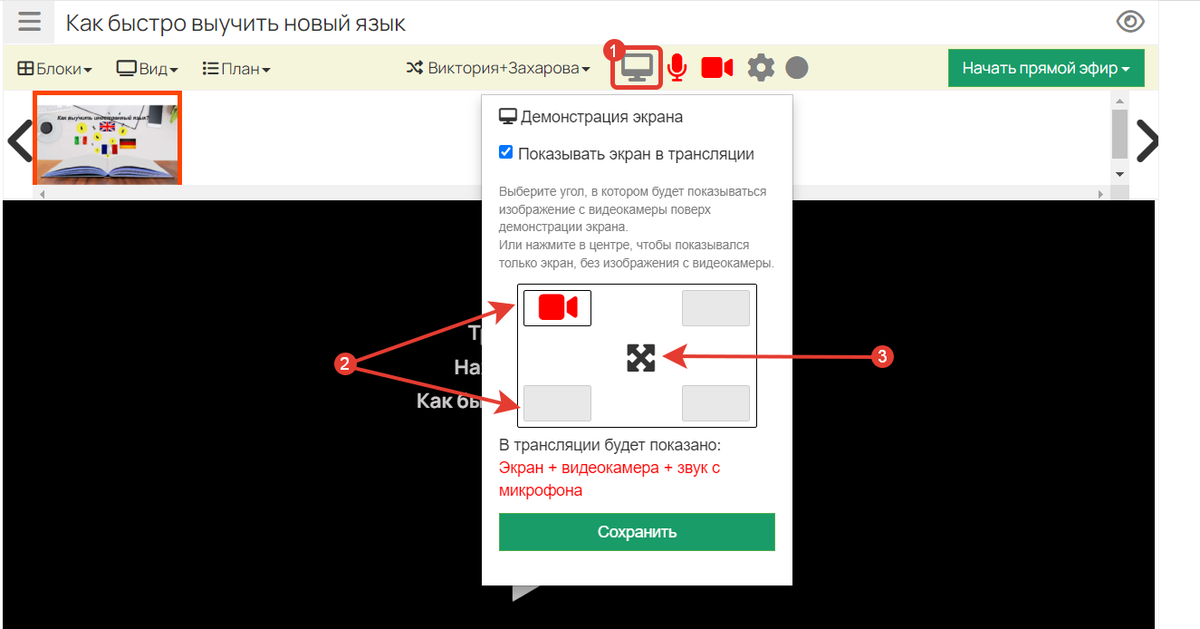При проведении вебинара можно включить демонстрацию экрана. Для этого в вебинарной комнате: