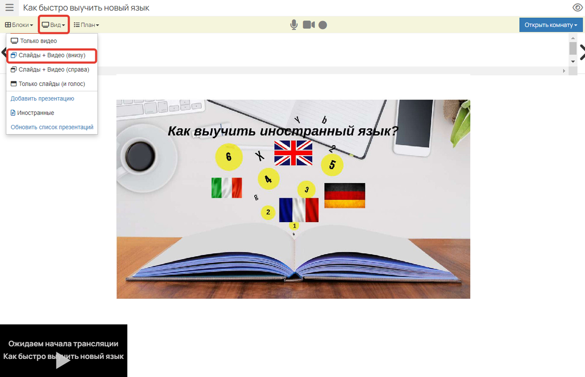 Как открыть вебинарную комнату и начать трансляцию