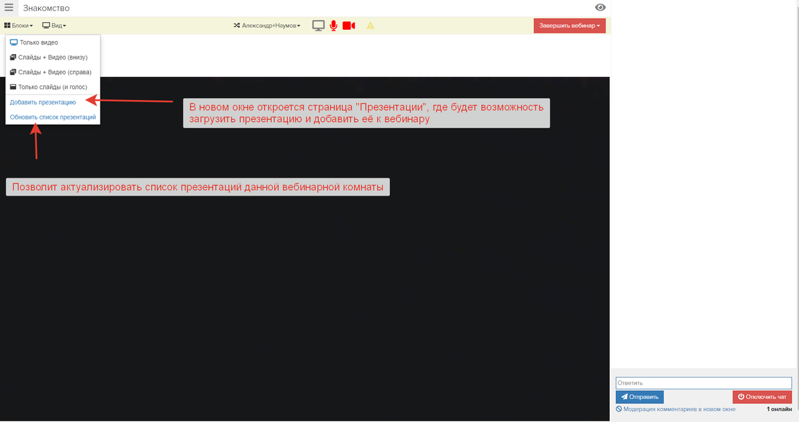- Вернитесь к вкладке с вебинаром и обновите перечень презентаций.