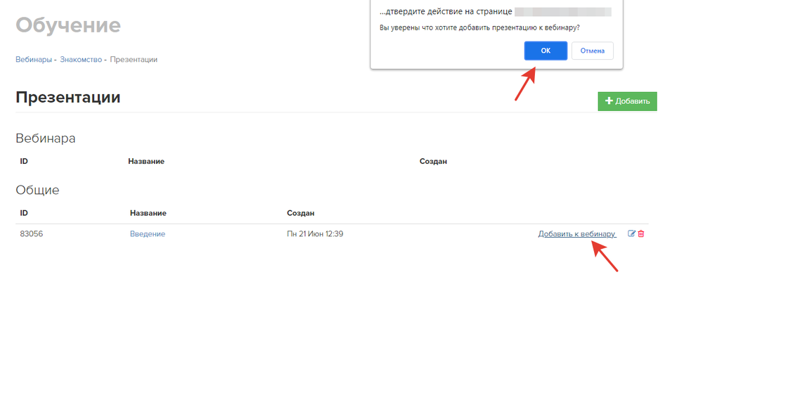 - В появившемся окне рядом с подготовленной презентацией нажмите кнопку «Добавить к вебинару».