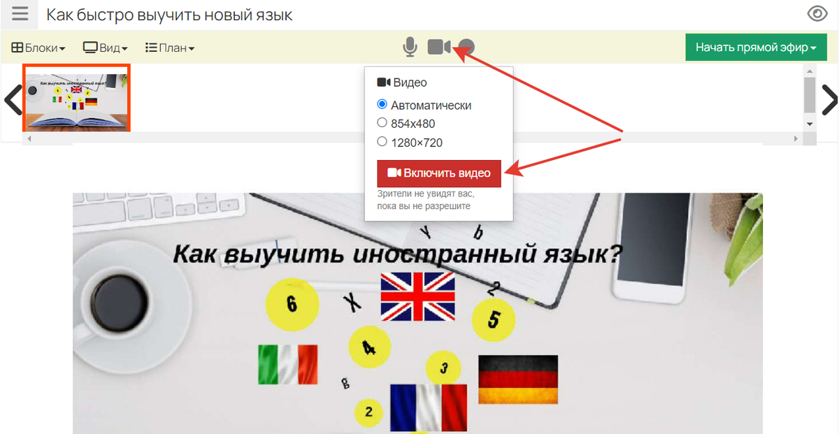 Рекомендуется запускать видеопоток непосредственно перед открытием комнаты, так как во время вебинара зрители могут перемотать его до момента включения камеры и, например, увидеть процесс подготовки к вебинару.