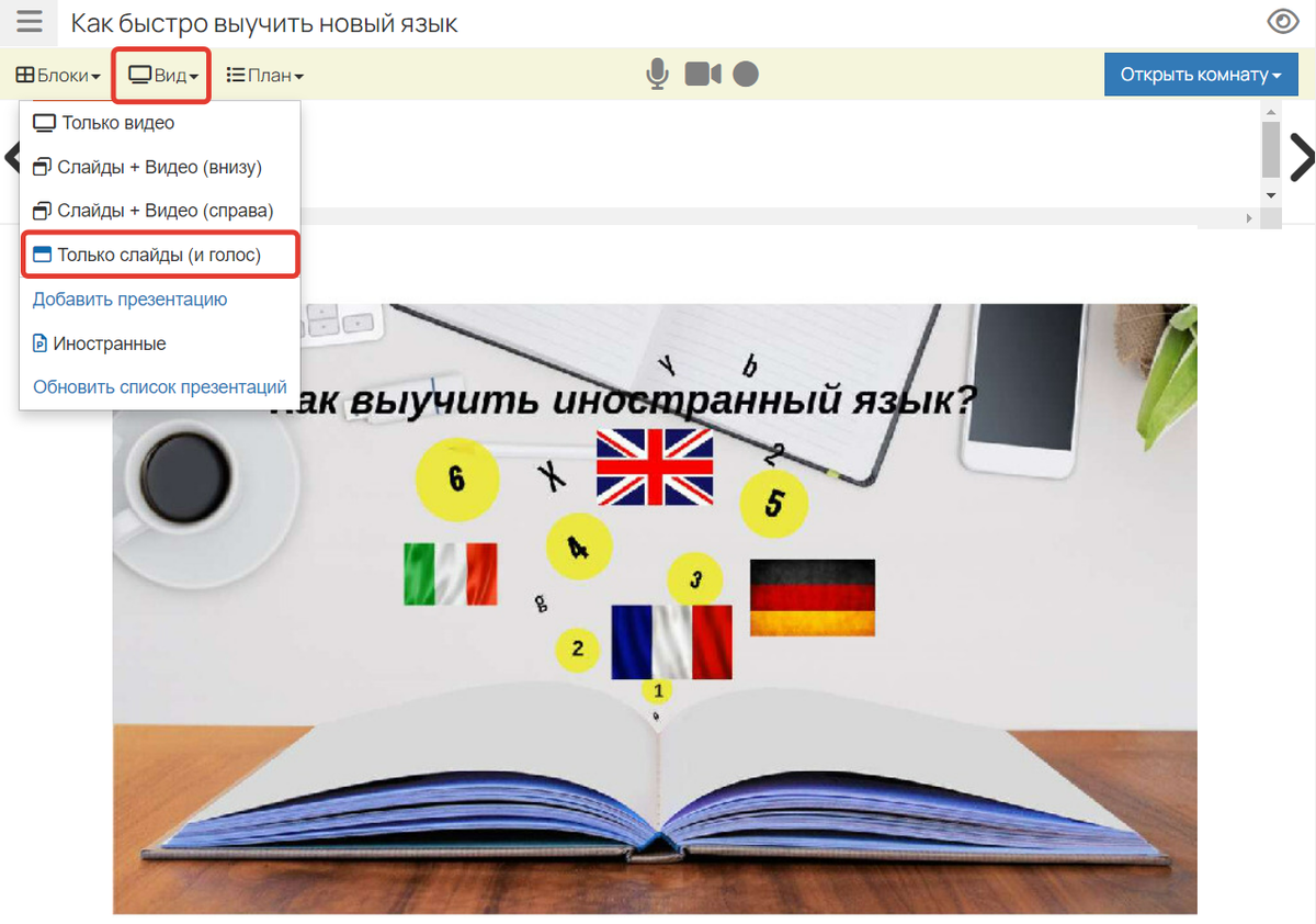 Чтобы добавить презентацию в вебинар: