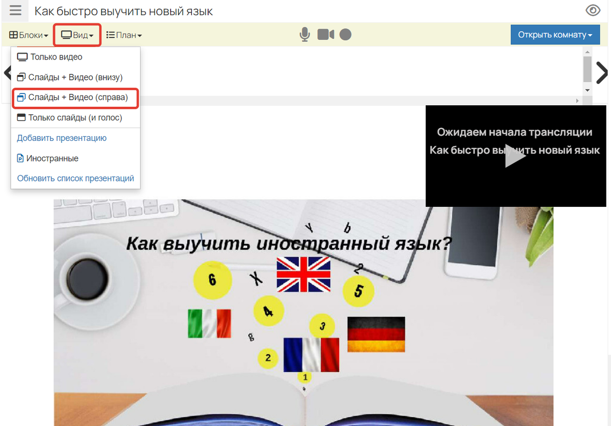 - Слайды + Видео (справа).