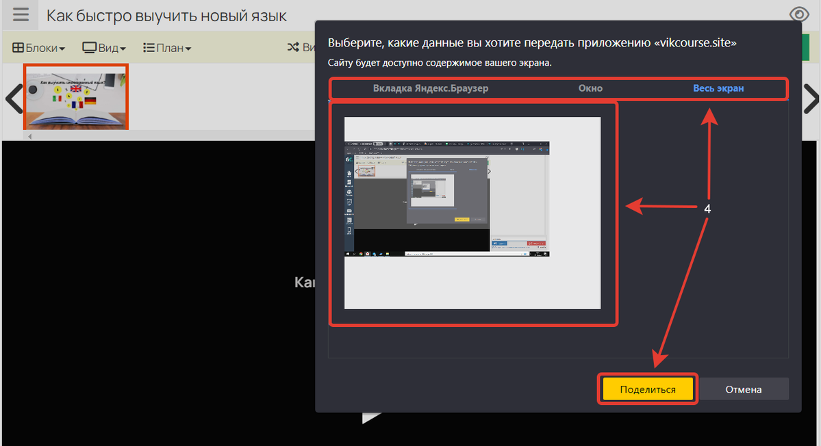 - Затем выберите источник для демонстрации и нажмите «Поделиться».