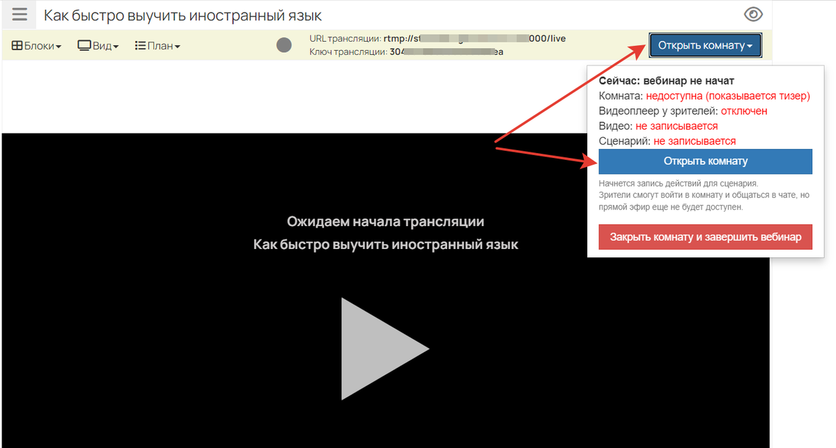 | Открыта | Комната для вебинара без запущенной трансляции | Начать трансляцию |