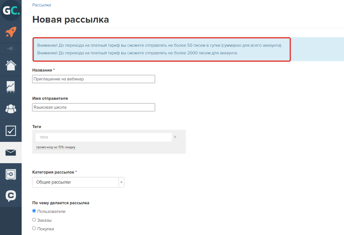 - в течение всего срока действия в ознакомительном тарифе число отправленных из аккаунта писем и уведомлений не должно превышать 2000;