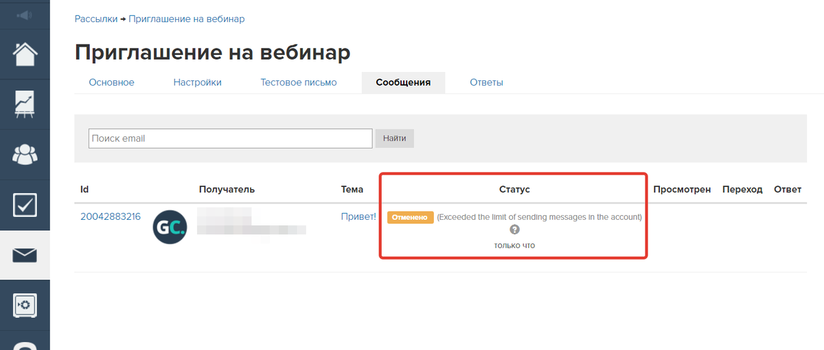 Если превышен лимит по количеству писем, новые рассылки создаваться не будут, а уже существующие получат статус «Отменено».