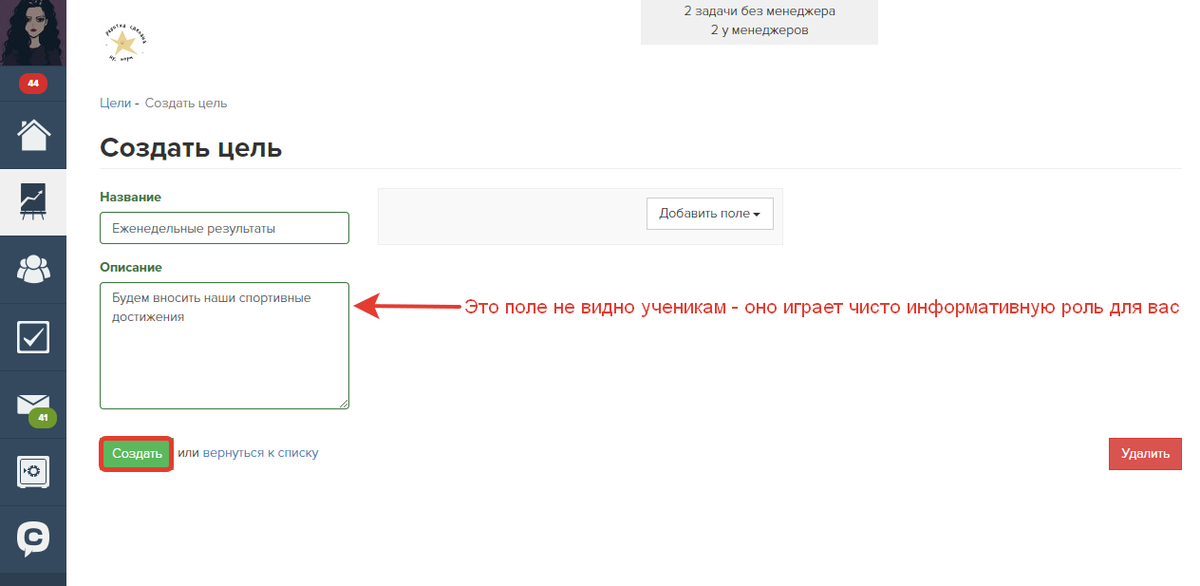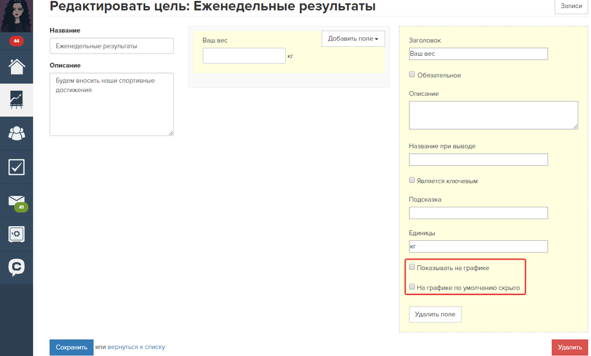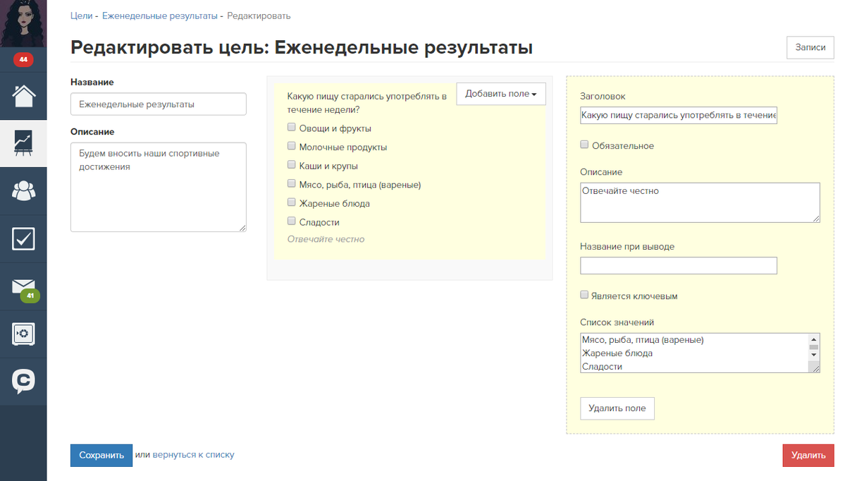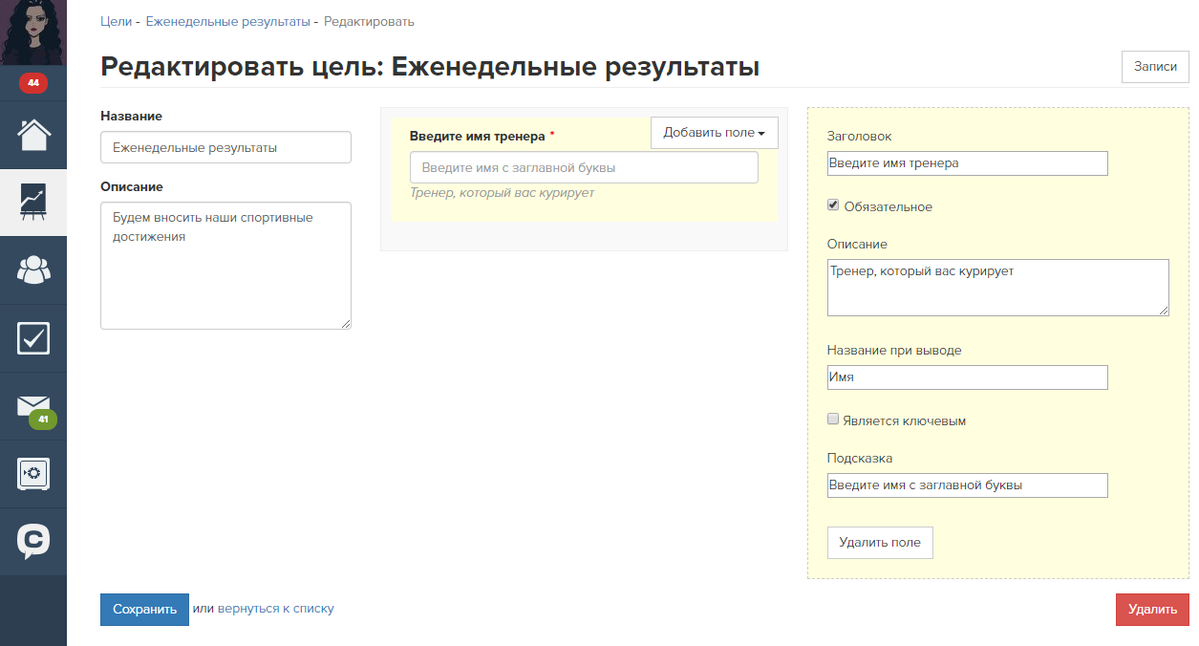 Будьте внимательны: нажатие красной кнопки «Удалить» полностью удаляет всю цель, а белая — лишь выбранное поле. Не промахнитесь!