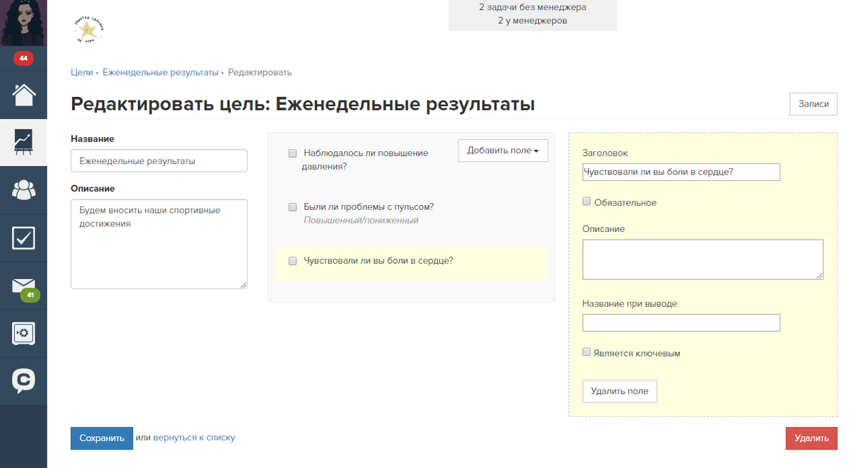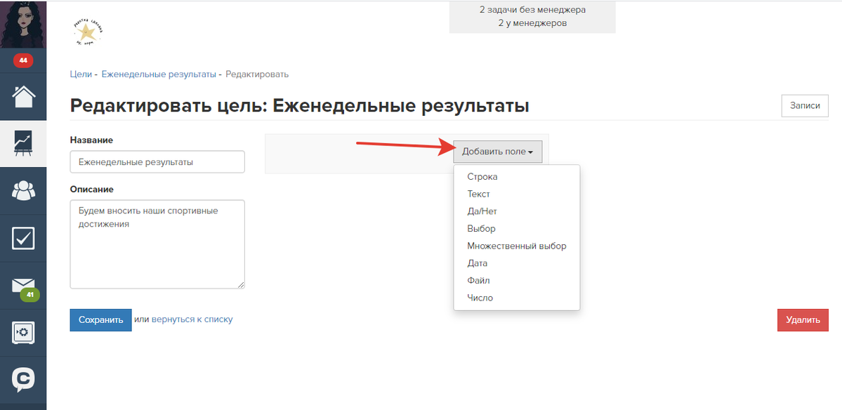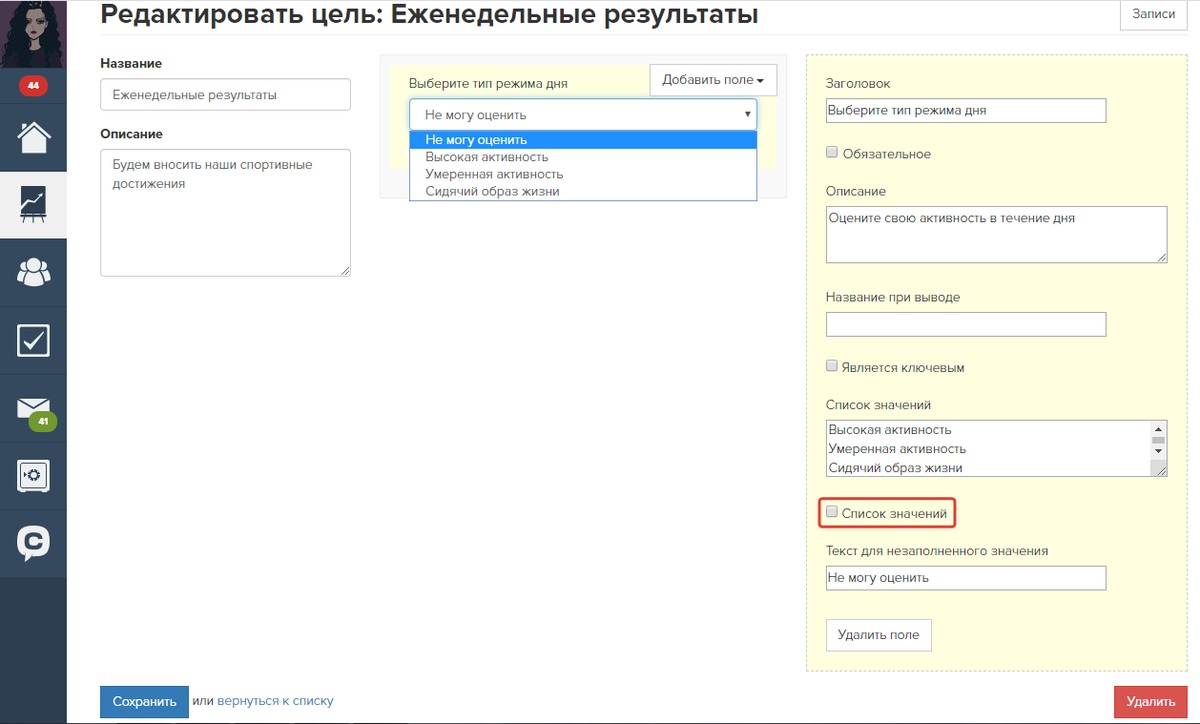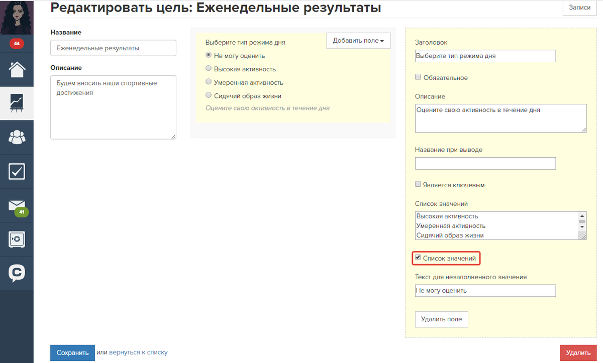 Будьте внимательны: нажатие красной кнопки «Удалить» полностью удаляет всю цель, а белая — лишь выбранное поле. Не промахнитесь!