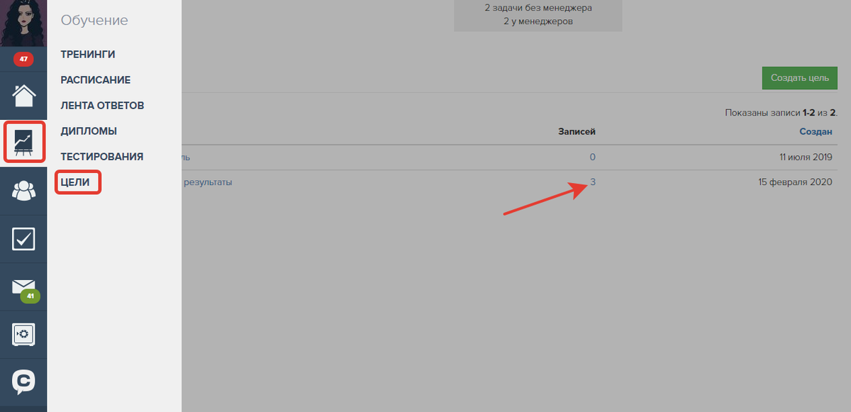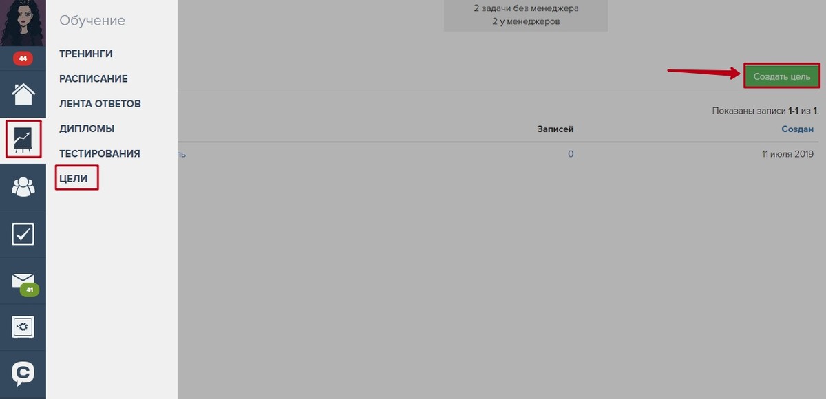 - На вкладке «Обучение» переходим в раздел «Цели».