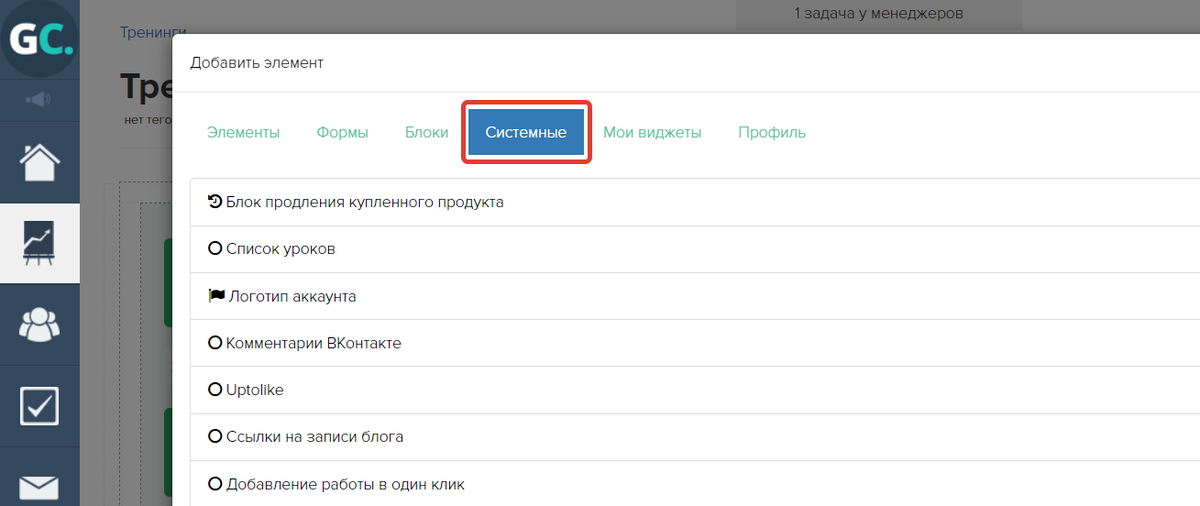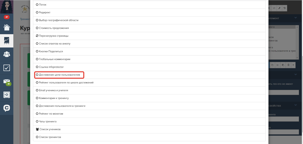 Чтобы ученик также мог увидеть свои результаты, выводимые на страницу (например, конкретного тренинга), при настройке вида, позволяющей отобразить системный блок «Достижение цели пользователем».