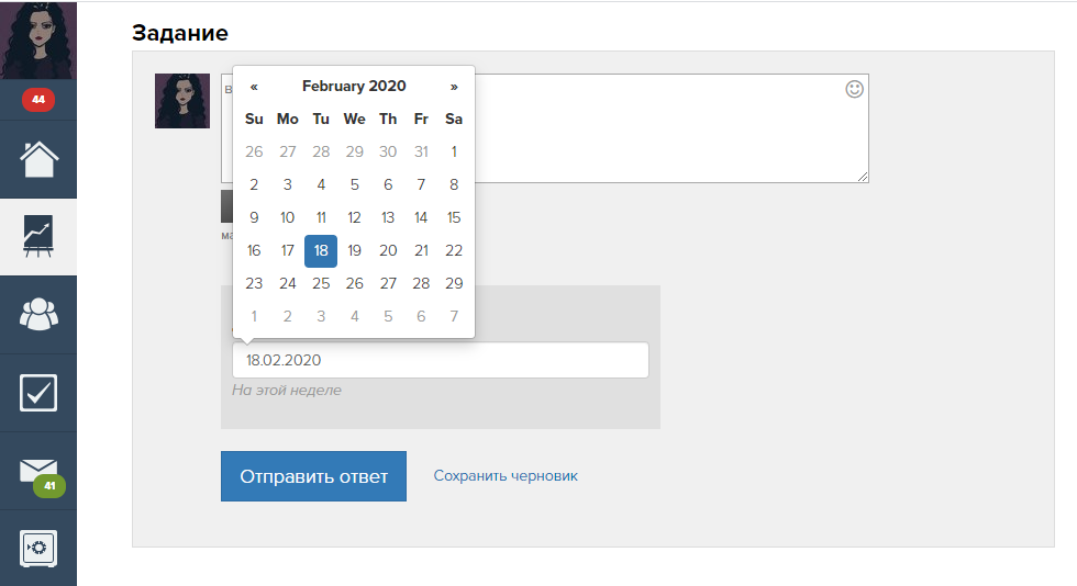 Поле, позволяющее ученику выбрать дату в календаре для ответа.