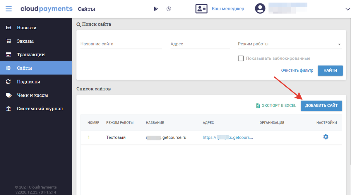 Чтобы создать сайт, войдите в личный кабинет CloudPayments, затем перейдите в раздел «Сайты».