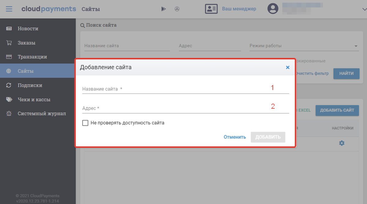 Добавьте сайт, указав его название и адрес. Эти данные можно скопировать в настройках аккаунта в разделе «Интеграция» — «Перейти к ручной настройке интеграций онлайн-касс и платежных агрегаторов» — «CloudPayments».