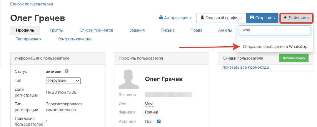 В карточке по кнопке «Действия» – «Отправить сообщение в WhatsApp» администратор может отправить сообщение пользователю. Сообщение будет доставлено, если с момента последнего обращения от пользователя прошло не более 24 часов.