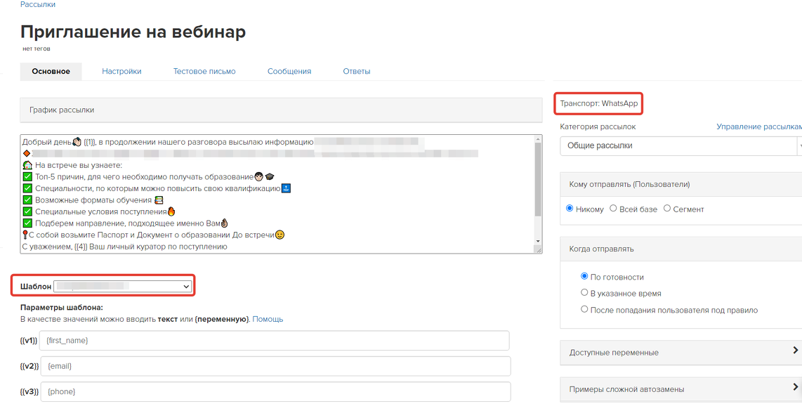- Текст не может быть произвольным — он должен соответствовать заданному шаблону! Шаблон заранее должен быть одобрен у провайдера WhatsApp. Шаблон содержит места для подстановки значений (например, имя, номер заказа, название мероприятия, дата и т.п.)