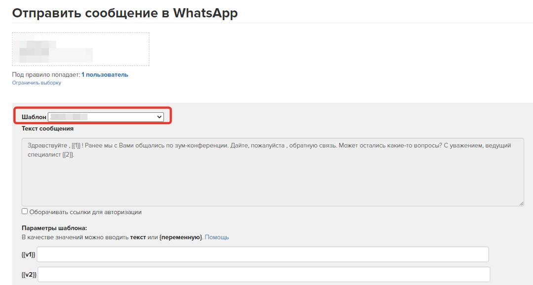 Чтобы отправить шаблонное сообщение, воспользуйтесь функцией «Отправить сообщение в WhatsApp» в разделе «Пользователи» или в карточке пользователя, выбрав нужный шаблон.