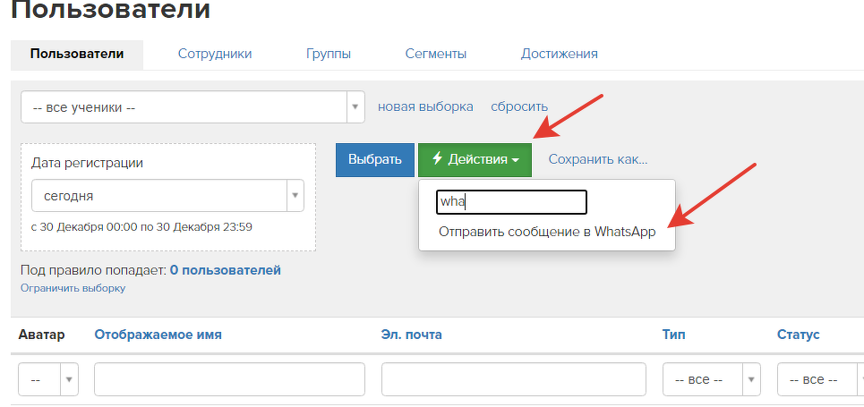 - Условие для пользователей «Было входящее из WhatsApp» — используется для проверки привязки мессенджера к пользователю.