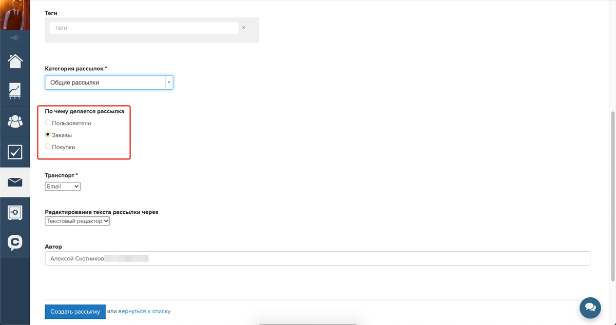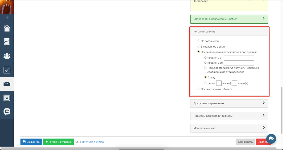 В разделе «Когда отправлять» следует выбрать вариант «После попадания под правило» — «Сразу», чтобы обеспечивалась автоматическая отправка рассылки.