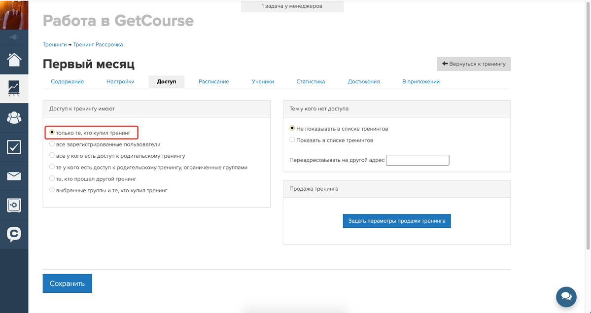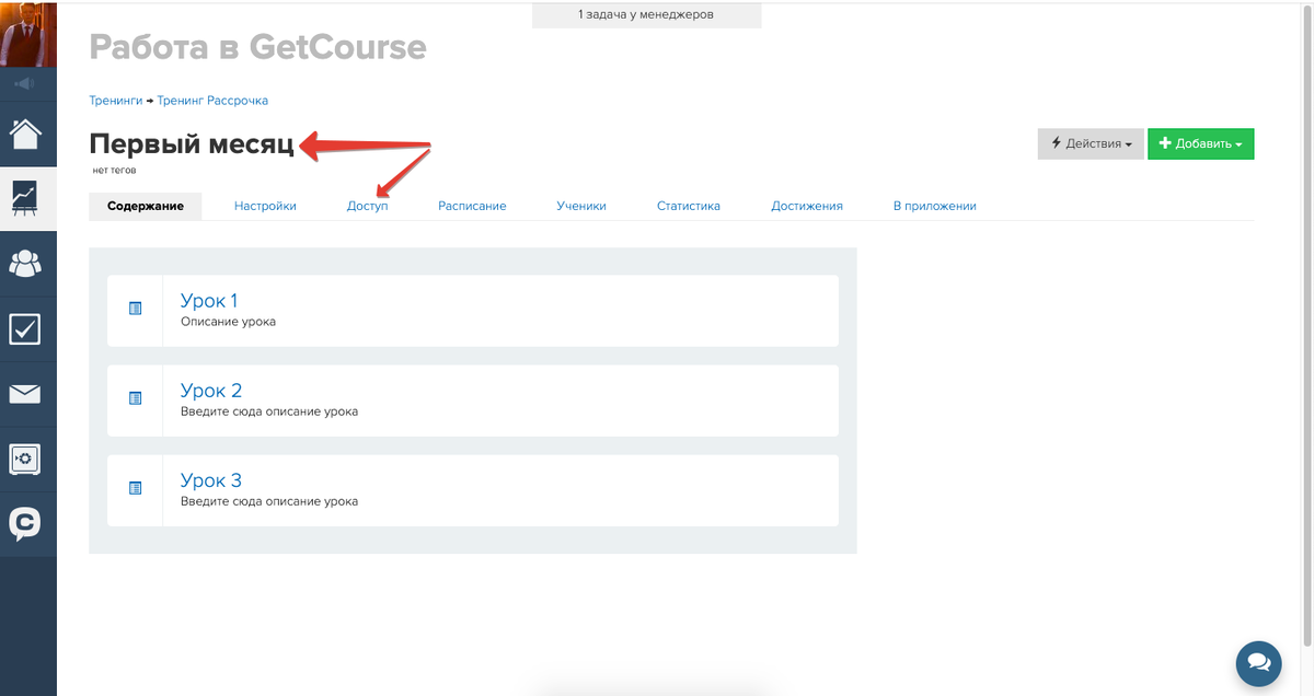 - Необходимо, чтобы уроки не распределялись по модулям и предоставлялись последовательно — их можно разместить в основном тренинге, скрыв от учеников. При этом следует контролировать оплаты и давать доступ к отдельным урокам с помощью операции «Дать доступ к уроку». Доступ к тренингу удобнее организовать по группе: создать продукт без доступа и в зависимости от поступления платежа регулировать добавление пользователя в группу и его удаление.