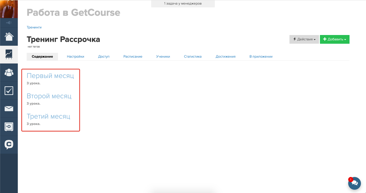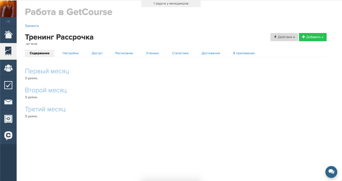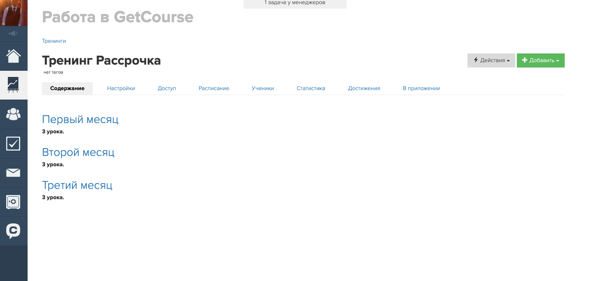 Функционал процессов позволяет организовать рассрочку без использования нескольких продуктов и предложений. Рассмотрим пример из пункта 1: оплату следует разделить на три равные части, которые вносятся ежемесячно. При оплате каждого месяца пользователь получает доступ к соответствующей части материалов. Если за следующий месяц платеж не произведён, доступ к уже оплаченным материалам сохраняется. Для удобства материалы распределены по подтренингам.