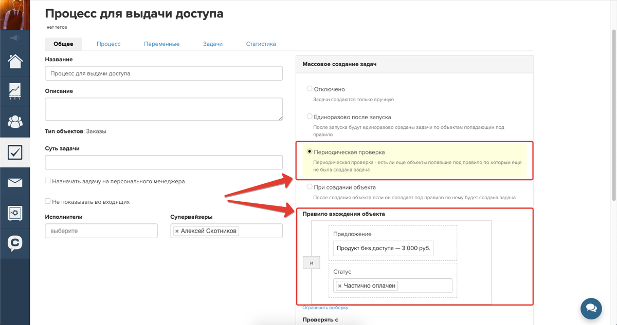 Необходимо настроить процесс для объекта «Заказы» с периодической проверкой. Во входном условии следует указать «Предложение» с выбором созданного предложения и «Статус — частично оплачен».