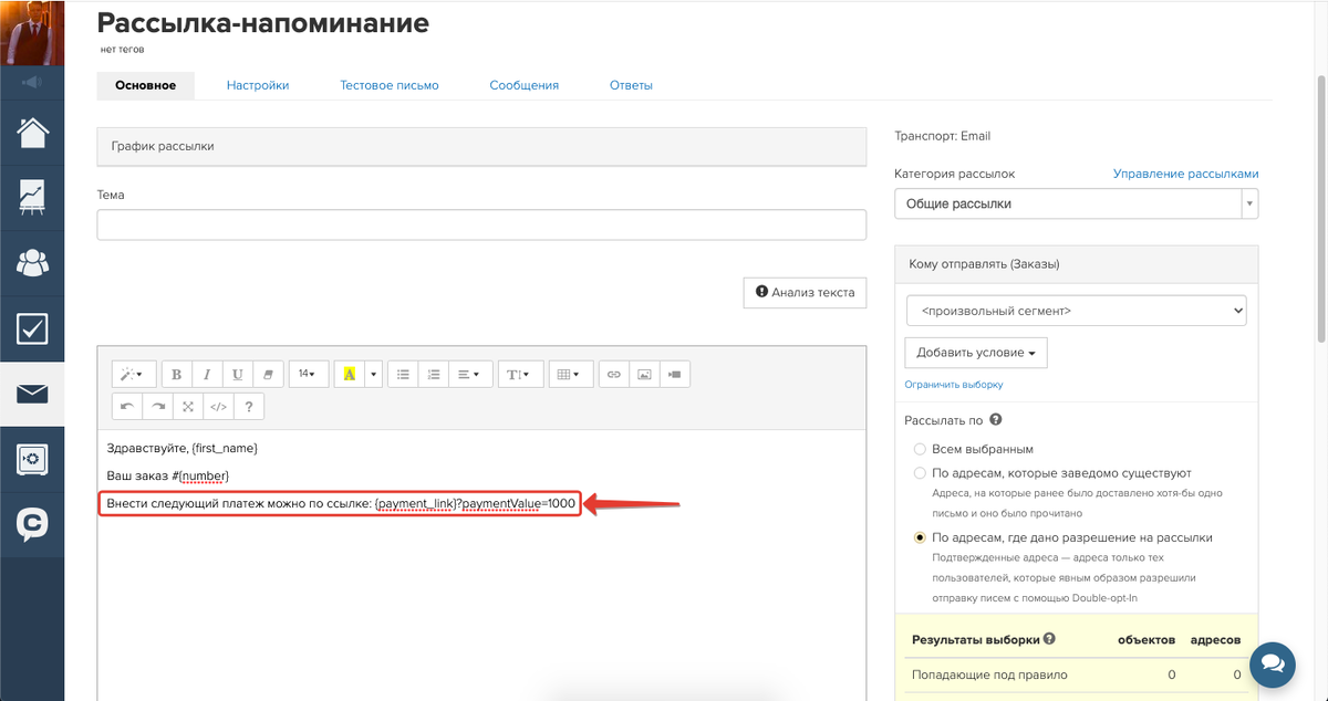 Создайте рассылку для объекта «Заказы». В тексте рассылки добавьте ссылку вида {payment_link}?paymentValue=1000