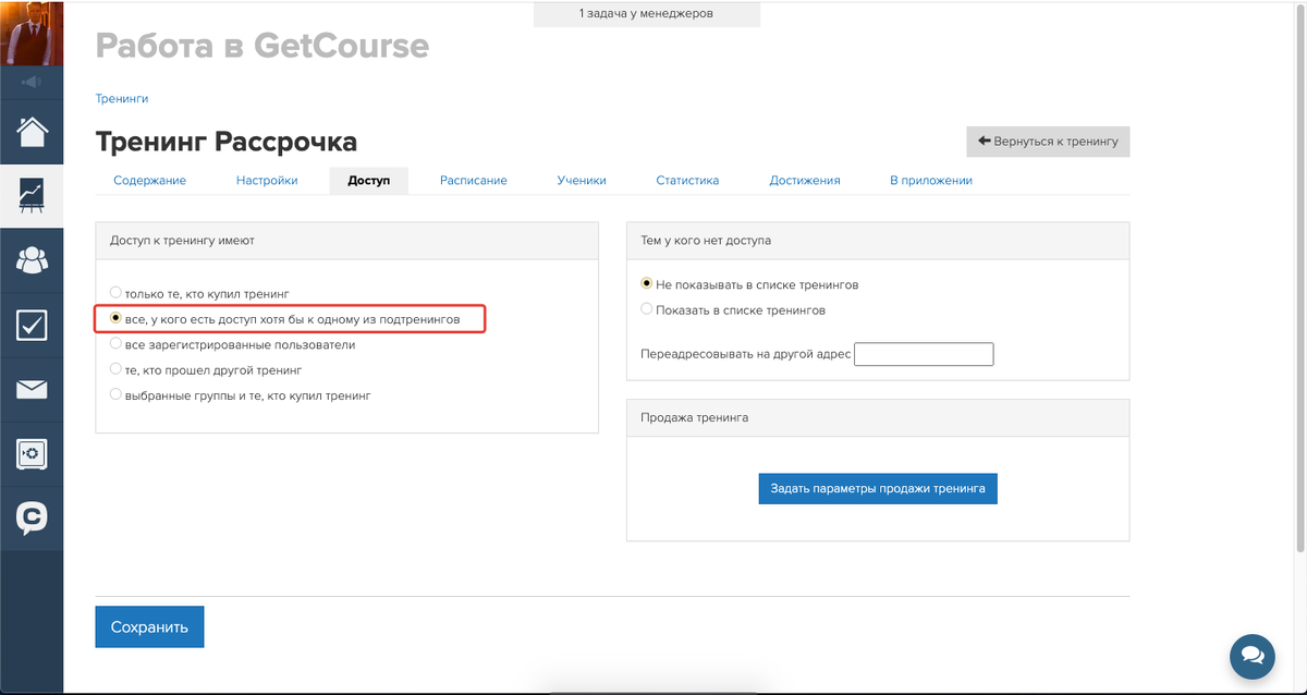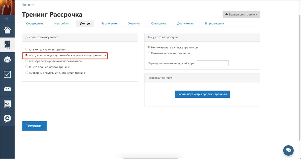Доступ к подтренингам следует организовать по группам. Каждому подтренингу требуется своя группа.