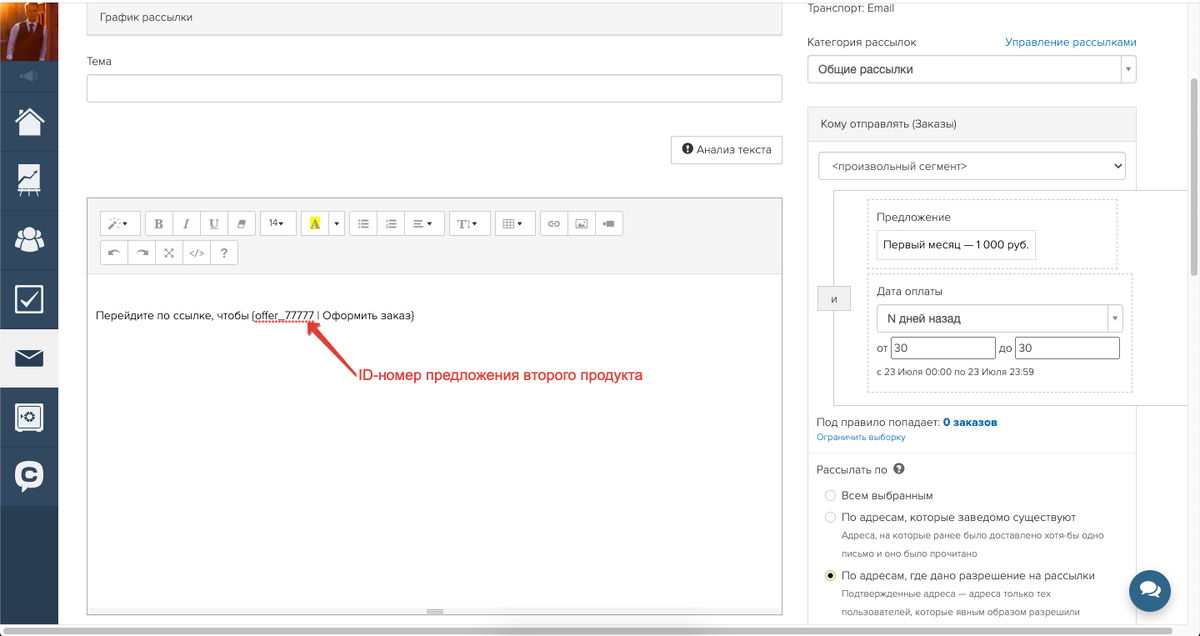 В рассылке для оплаты второго месяца в разделе «Кому отправлять» нужно добавить условие «Предложение» с указанием предложения первого продукта. Затем следует выбрать «Дата оплаты» — опцию «N дней назад» и задать 30 дней. Таким образом, рассылка будет отправлена по заказам первого месяца, оплаченным 30 дней назад.