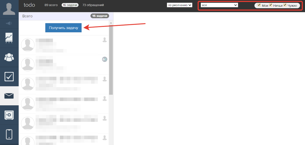 Исполнителям в разделе «Входящие» для конкретного процесса будет отображаться кнопка «Получить задачу». При нажатии на неё сотруднику назначается самая старая задача по выбранному фильтру процесса (если выбран фильтр «Все», то самая старая из всех скрытых задач).