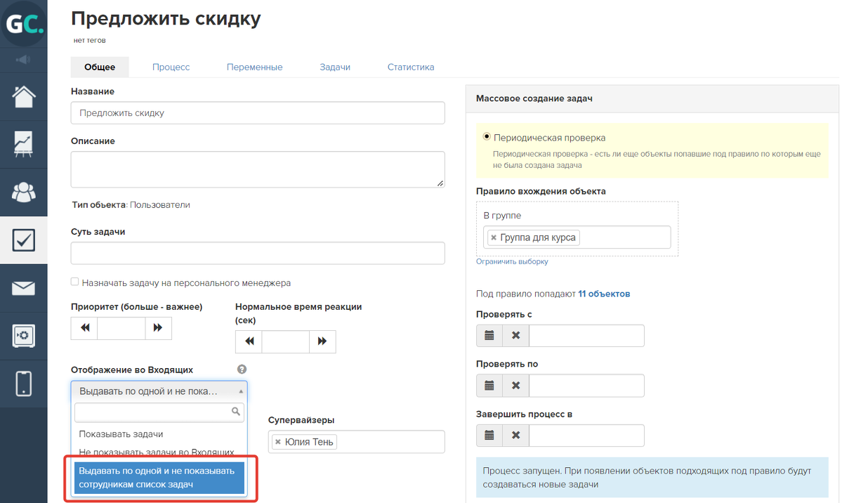 В процессе можно настроить способ отображения созданных задач для менеджеров в списке задач раздела «Входящие».