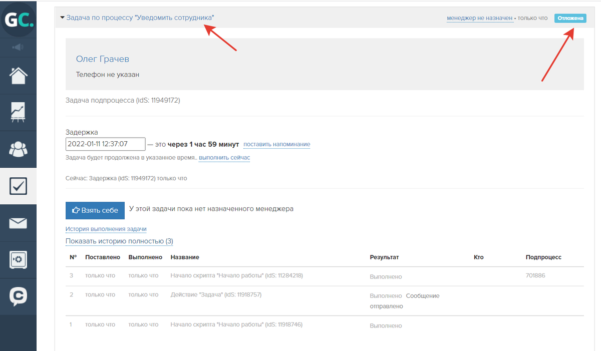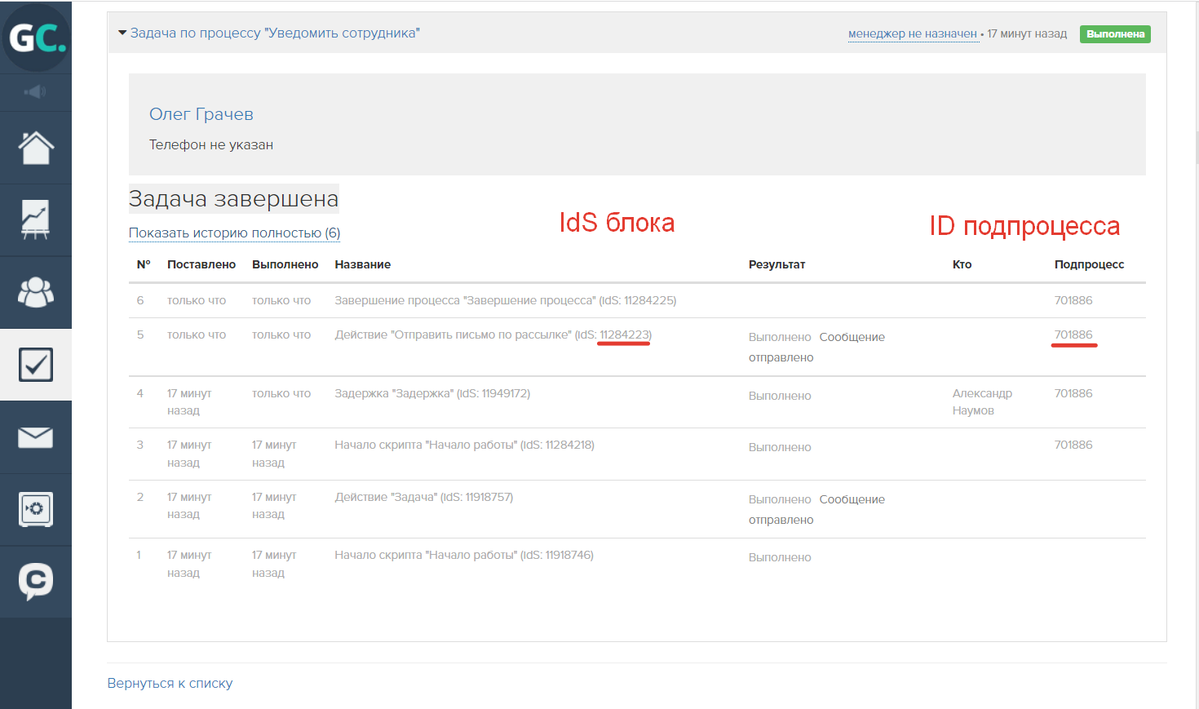 Нажмите «Показать историю задач», чтобы ознакомиться с временем постановки и выполнения задачи на каждом этапе, а также с названием действия.